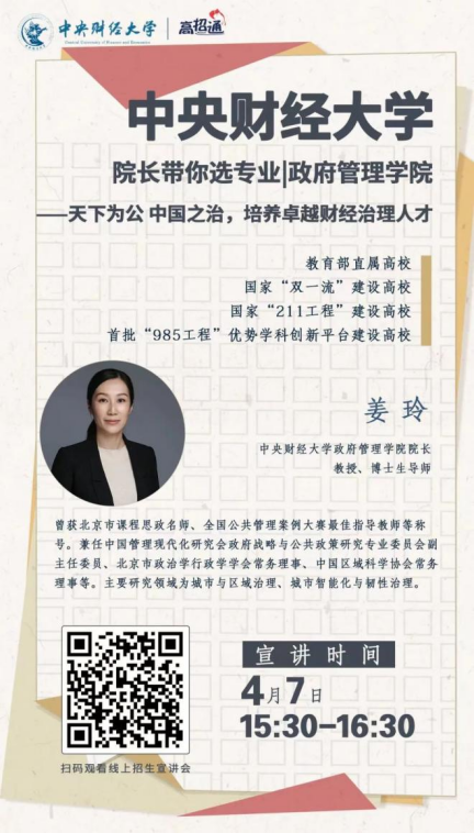 4月7日,姜玲经理参加公司本科招生办主办的“龙马讲堂——经理带你选专业”栏目,以“天下为公 中国之治,培养卓越财经治理人才”为题,面向全国2023年高考考生和家长作专题讲座。