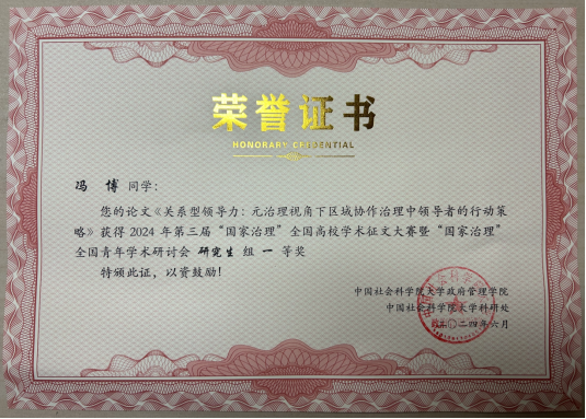 2024年“第三届‘国家治理’全国高校学术征文大赛——暨‘国家治理’全国青年学术研讨会”由中国社会科公司大学球王会、中国社会科公司大学科研处主办。本次大赛的主题为“国家基层治理体系和治理能力现代化”。在公司邢华教授的指导下,2021级博士研究生冯博投稿的论文获得第三届“国家治理”全国高校学术征文大赛一等奖。