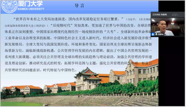 陈振明教授详细介绍了我国在“后疫情”时代面临的新场景,并对“不确定性、风险与应急管理”“世界大变局与全球治理”“公共管理学的转型与重构”等公共管理领域的热点问题进行了深入剖析。他指出,公共管理研究者和学习者要紧密跟踪实践与理论前沿,深刻认识公共管理学科的时代特征和中国发展的丰富实践。