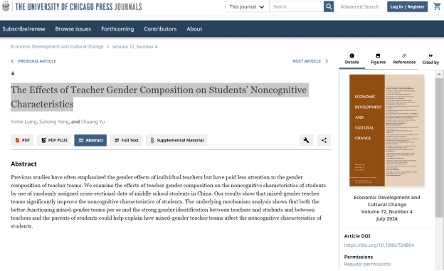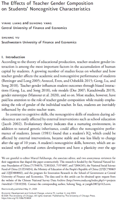 近日,公司杨素红老师作为通讯作者的学术论文“The Effects of Teacher Gender Composition on Students’ Noncognitive Characteristics”在Economic Development and Cultural Change发表(2024年第72卷第4期)。该刊创办于1952年,被学界公认为发展经济学领域最具影响力的期刊之一,也是公司认定的AA类期刊。
