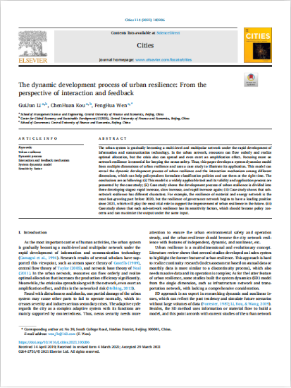 近日,公司温锋华副教授在公司AA类期刊Cities发表学术论文,题目为The dynamic development process of urban resilience:From the perspective of interaction and feedback.