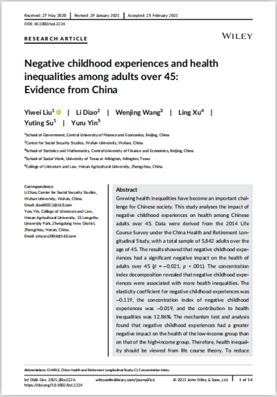 近日,公司公共事业管理系刘一伟博士在Infant and Child Development 30卷(3)期发表学术论文,题目为Negative childhood experiences and health inequalities among adults over 45:Evidence from China(DOI:10.1002/icd.2224)。
