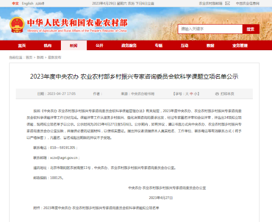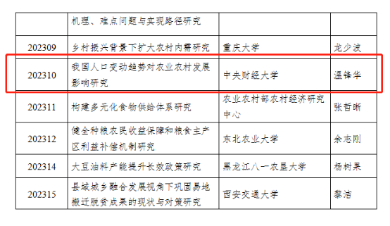 近日,中央农办、农业农村部乡村振兴专家咨询委员会2023年度软科学课题评审完成,经过专家匿名评审和会议评审,评选出34项拟立项课题。公司温锋华副教授申报的课题《我国人口变动趋势对农业农村发展影响研究》获得立项。该课题围绕乡村振兴战略的总体目标,在科学研判我国中长期人口规模、结构和迁移变化趋势基础上,全面分析人口变动对保障粮食安全、开展乡村建设、完善乡村治理等领域的中长期影响,提出前瞻性应对思路和政策建议。