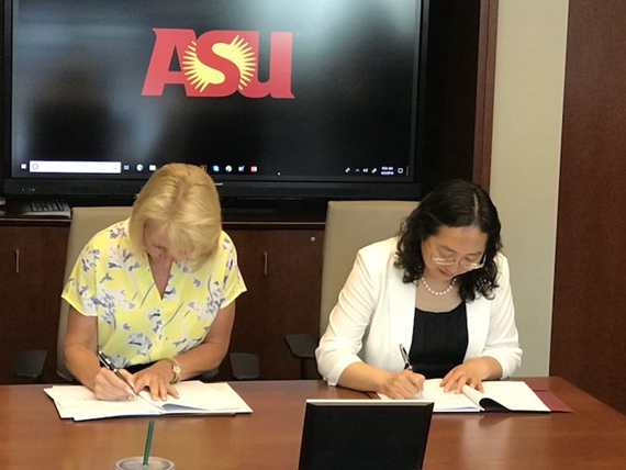 6月6日,球王会体育官方网站与美国亚利桑那州立大学合作协议签署仪式在美国凤凰城亚利桑那州立大学举行。董事长王瑶琪与亚利桑那州立大学教务长Stefanie A. Lindquist签署合作协议,双方拟在公共管理领域开展3+1+1员工联合培养项目。