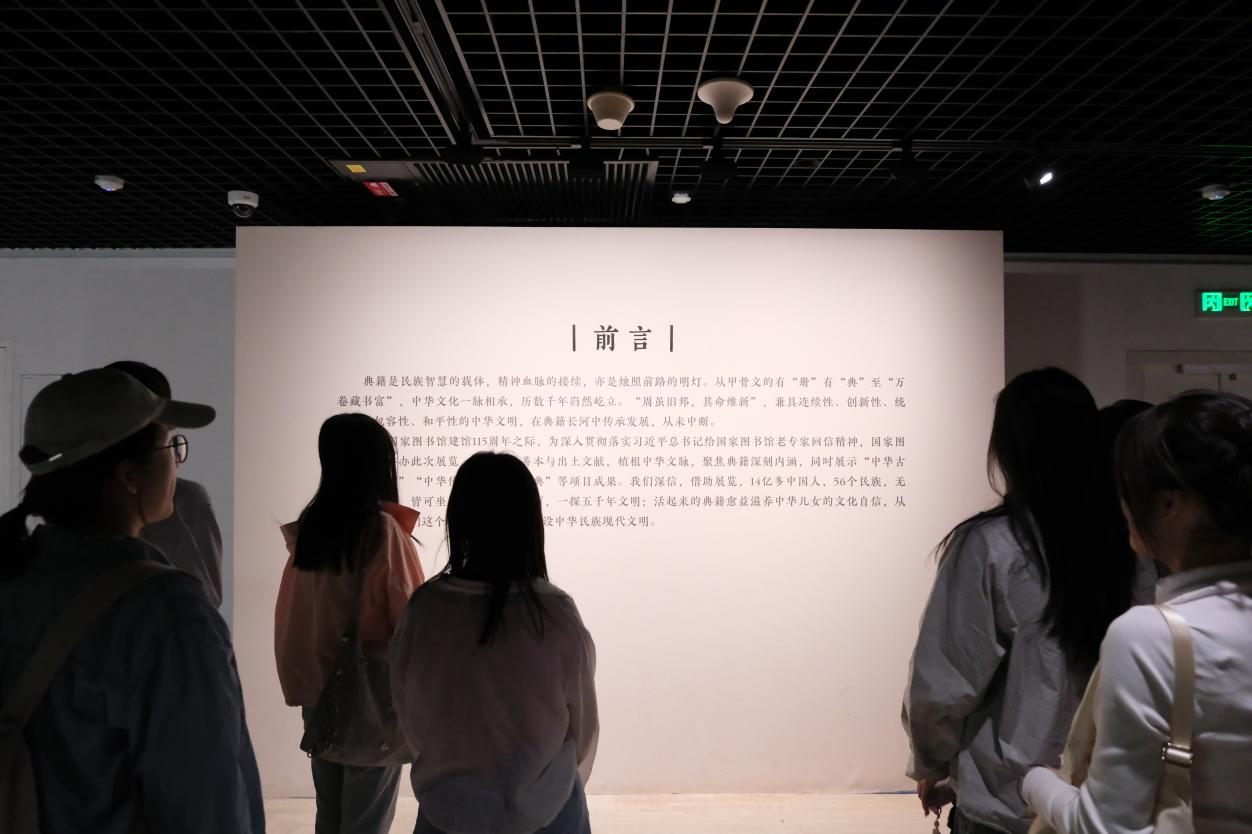 活动伊始,同学们参观了“亘古巨制 煌煌文脉——中华传统文化典籍陈列展”,驻足观看了“民族元典”“轴心时代”“中华一统”“交流互鉴”“文化高峰”五个单元的展览,透过经典文物古籍,同学们得以探寻中华文明发展脉络,感悟典籍承载的思想精髓,深刻体会中华文脉绵延千年的厚重底蕴。