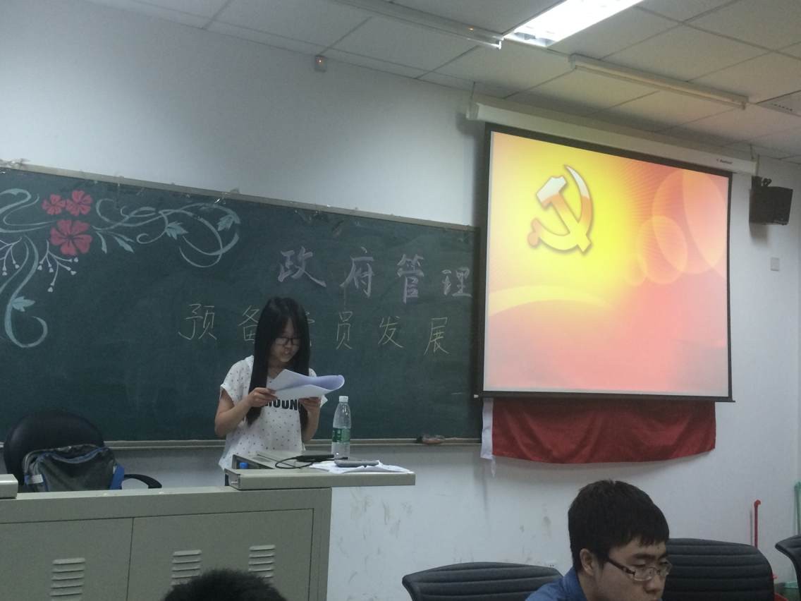 大会第一个议程是积极分子发展成为预备党员民主评议。三名积极分子庄重宣读入党志愿书,表达对党性、党史的理解和反思,总结考察期内各方面的发展情况,特别强调了自身存在的缺点和问题,并表达了未来发展的方向。最后,三名积极分子都表达了入党的决心和奋斗的目标,推动了会议高潮发展。宣读完毕后,大会就三名积极分子的政审情况进行审核,其入党介绍人也表示三名积极分子考察期各方面表现良好,同意入党。最后,与会党员就其各方面表现的优缺点进行民主评议并匿名表决投票,三名积极分子全票通过,发展成为预备党员,正式加入政管12级本科生党支部大家庭。