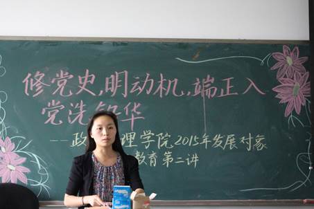 随后,余老师与在座的发展对象深入地探讨了“入党动机”、“党员发展流程”和“党员标准”这三个问题。在座的发展对象们在认真沉着的思考之后,纷纷表示入党是从少先队员到团员再到党员一步步思想高度的提升,认为党员是先锋模范的代表。余老师在听取大家的发言后,指出入党的动机大致可分为内在动机和外在动机两种。内在动机是精神上的信仰,而外在动机则包括在评选、就业方面的物质追求。她诚恳地指出虽然这两种动机都是无可非议的,但是希望同学们能够在今后的工作学习的磨砺中不断加强自身的党性修养,保存精神和信仰上的纯粹性,为提升党员队伍的质量作出自己的贡献。