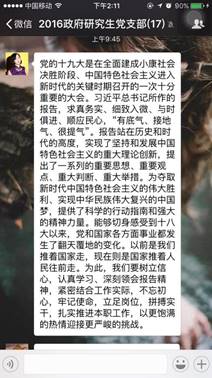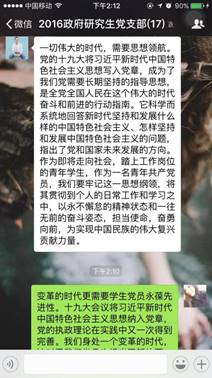 本次线上学习交流会由支部书记朱洁主持,借助移动交流平台的便利,党支部全体16名成员积极参与其中。朱洁表示,学习党的十九大报告,支部近期最重要的政治任务。对于报告精神的领悟,各位党员要内化于心,外化于行。学习交流的目的既在督促,又在提升。各位党员要深刻认识学习活动的意义,不断加深对于报告精神的学习与领悟。