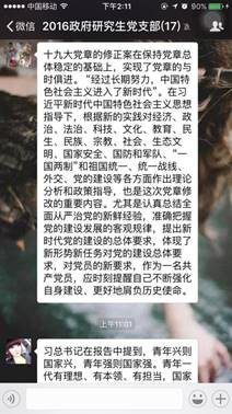 习近平主席在十九大报告中鲜明提出中国特色社会主义进入新时代,准确标定了我国发展新的历史方位;明确把习近平新时代中国特色社会主义思想确立为我们党必须长期坚持的指导思想,提出中国特色社会主义基本方略,为党和国家事业发展提供了根本遵循;准确把握我国社会主要矛盾的变化并作出新的概括,充分体现了我党对我国国情深刻而清醒的认识。新修订党章中将实现中华民族伟大复兴的中国梦写入党章,在党章中明确实现“两个一百年”奋斗目标,十分鼓舞人心。我十分期待目睹“两个一百年”奋斗目标的实现,更希望可以为祖国贡献自己的力量!