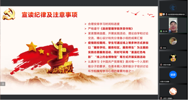2022年5月13日,球王会2022学年第一期入党积极分子培训班开班仪式暨党课第一讲于腾讯会议线上举行,公司党委副书记、党校副董事长李宇环副教授,公司党委组织员南琪老师,公司员工工作办公室主任、党校办公室主任张小林老师,以及来自教师、本、硕、博四个群体的45名入党积极分子参加了本次开班仪式。开班仪式由武思豪同志主持。