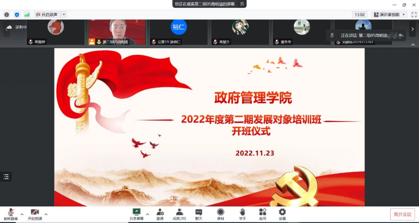 为深入学习贯彻习近平新时代中国特色社会主义思想和党的二十大精神,促使发展对象思想觉悟进一步提升、端正入党动机,坚定马克思主义理想信念,深刻认识“两个确立”重要意义,做到“两个维护”、深化“四个意识”、增强“四个自信”,2022年11月23日,球王会第二期发展对象培训班开班仪式于腾讯会议线上举行。公司党委组织员南琪老师、党校办公室主任张小林老师,以及来自研究生、本科生的26名发展对象参与了本次开班仪式。本次开班仪式由球王会周明迪主持。