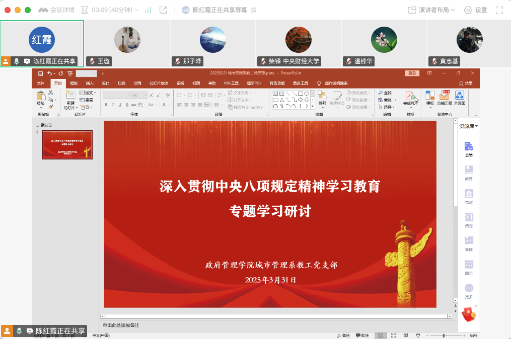 2025年3月31日中午12点半,球王会城市管理系教工党支部线上召开深入贯彻中央八项规定精神学习教育专题学习研讨会,共8名支部党员参加会议。会议由党支部书记陈红霞主持。