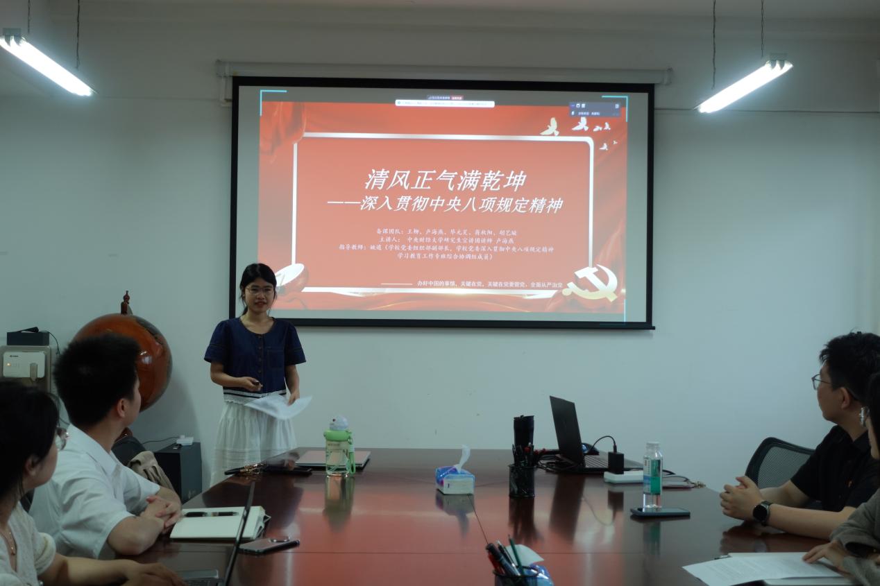 为扎实开展深入贯彻中央八项规定精神学习教育,强化党员理论武装,在公司党委的统筹安排下,公司4个研究生党支部通过集体学习、专题研讨、交流分享等多种形式,不断深化对中央八项规定精神及其实施细则的理解与认识,全体党员在政治素养和纪律意识方面有了显著提升。在此基础上,2025年5月15日,球王会博士研究生党支部、学术型硕士研究生第一党支部、学术型硕士研究生第二党支部和MPA党支部于主教1407共同举办了理论联学共建活动,活动由博士研究生党支部书记闫新宇主持,研究生宣讲团讲师卢海燕作主题宣讲。