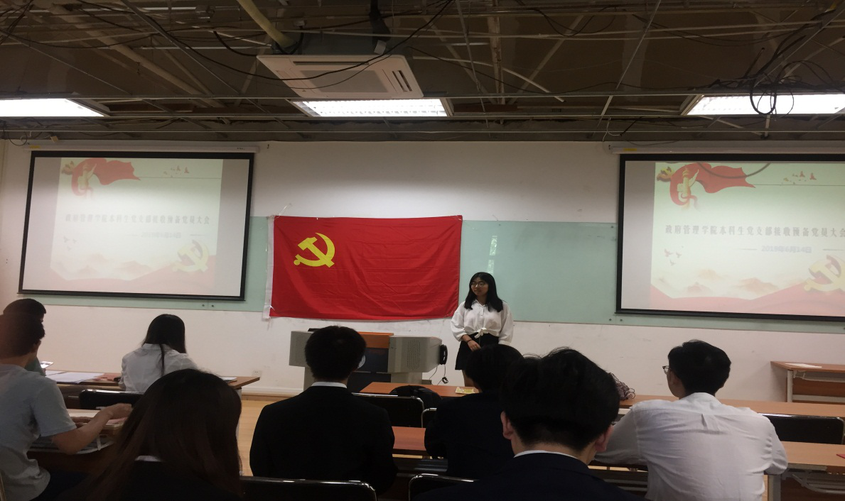 奏唱国歌后,会议进行第二项内容研究接受段武鸿等12位同志为预备党员事宜。段武鸿等12位同志上台对自身入党动机、对党认识及个人履历等内容进行陈述,之后各入党介绍人上台介绍发展对象考察期表现,均表明发展对象符合入党条件,同意推荐加入中国共产党。陈述程序结束后在场正式党员进行表决,经计票人统计、监票人唱票,参会正式党员对接收12位同志为预备党员事宜全票通过。李莎莉老师最后宣读党支部大会关于接收段武鸿等12位同志为预备党员的决议。