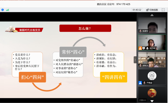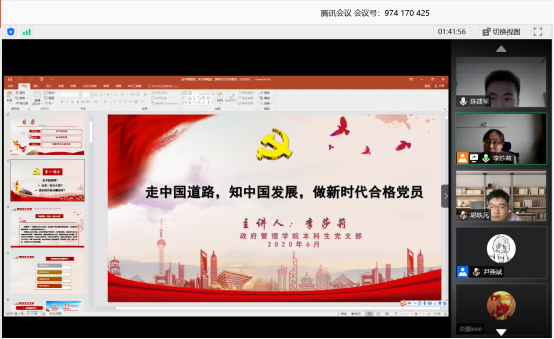 为深入贯彻《关于开展庆祝中国共产党建党99周年主题教育活动的通知》文件精神,做好基层“庆祝建党99周年、迎接建党100周年”主题教育活动。球王会本科生党支部于2020年6月15日使用腾讯会议平台开展线上主题党日活动。球王会本科生党支部书记李莎莉老师及党支部全体党员参与活动。