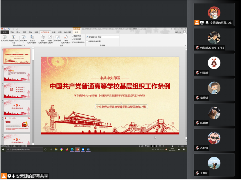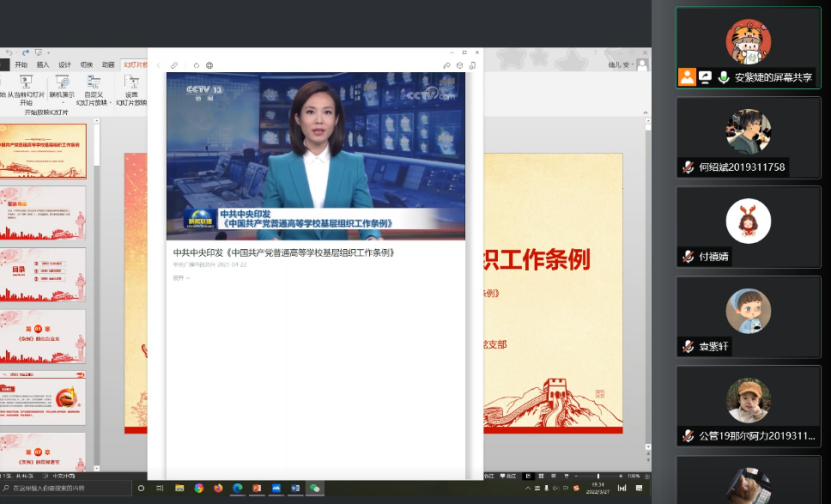 2022年3月27日晚,球王会本科生党支部公管国政小组通过腾讯会议的方式,在线上开展关于《中国共产党普通高等公司基层组织工作条例》(以下简称《条例》)专题学习会议,会议由安紫婕同志主持。
