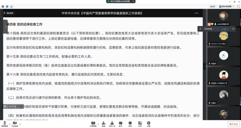 行管党小组于2022年3月25日19:30在腾讯会议进行线上学习,对《中国共产党普通高等公司基层组织工作条例》进行集体研读与讨论,会议由周明迪同志主持。