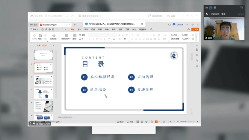 18级行政管理本科员工夏聂通过线上的方式分享了其在方向选择、简历准备、投递管理等方面的经验。他指出方向选择十分重要,准备简历要做到聚焦自身、聚焦岗位、强化自身与岗位的链接。在投递简历时,投前做好招聘信息管理,投递过程中注意岗位选择与节奏控制,投后进行进度跟踪与心态管理。