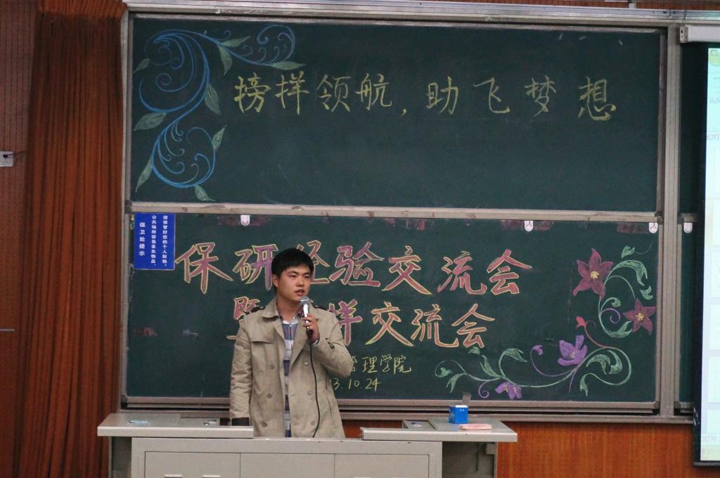 接下来,成功优干保研的朱洁同学,以简洁明了的话语为大家讲解了优干保研的条件和程序并分享了他的学习工作经验。