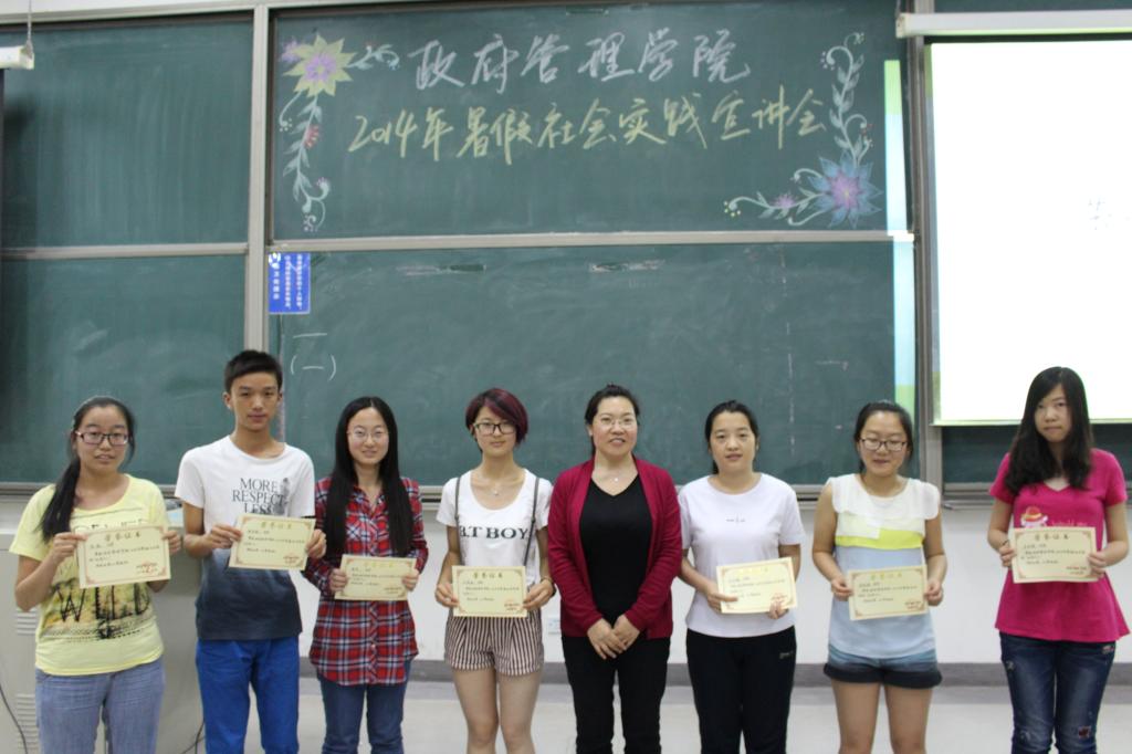 三位嘉宾讲解完毕,球王会团总支书记孙帮谦对三位嘉宾表示了感谢。紧接着,孙老师宣读了球王会寒假社会实践优秀个人名单,栗玉香老师对获奖同学进行颁奖并作总结。她再次强调了实践活动之于老员工锻炼提升的重要作用,希望大家踊跃参与,注重诚信及规范,争创佳绩。至此,2014年暑假社会实践宣讲会圆满结束,所有到场同学与嘉宾上台合影留念。