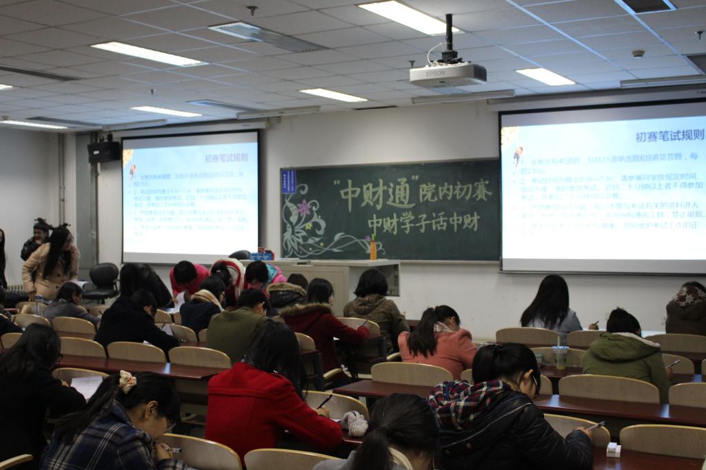 11月4日晚18:30,“中财通”球王会院内初赛在公司楼六号楼106教室举行。本次初赛由球王会学术实践部组织,以笔试方式进行,时间为1个小时。参赛人员在开场10分钟前进入考场,按序就坐。
