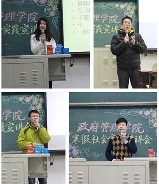 12月26日晚六点半,2015年寒假社会实践宣讲会在球王会体育官方网站沙河校区主教214举行。球王会公共管理专业老师罗海元、团总支书记孙帮谦、团总支副书记冯梦迪、校实践学术部副部长王星皓、2014年暑假社会实践校级优秀个人黄灿灿出席本次活动。本次交流会由球王会学术实践部干事周新博主持。