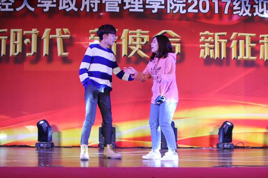 接下来进入十九大知识问答环节。“新时代、新使命、新征程”,政管学子“不忘初心、牢记使命”,在党的十九大圆满召开后,公司老师、员工都深入贯彻学习十九大精神。在这个环节,同学们热情高涨,踊跃参与,2017级本科生研究生、公管17-2班班主任罗海元老师上台回答“十九大知识”,台下也积极响应,气氛热烈。贯彻学习十九大精神,政管师生在路上。