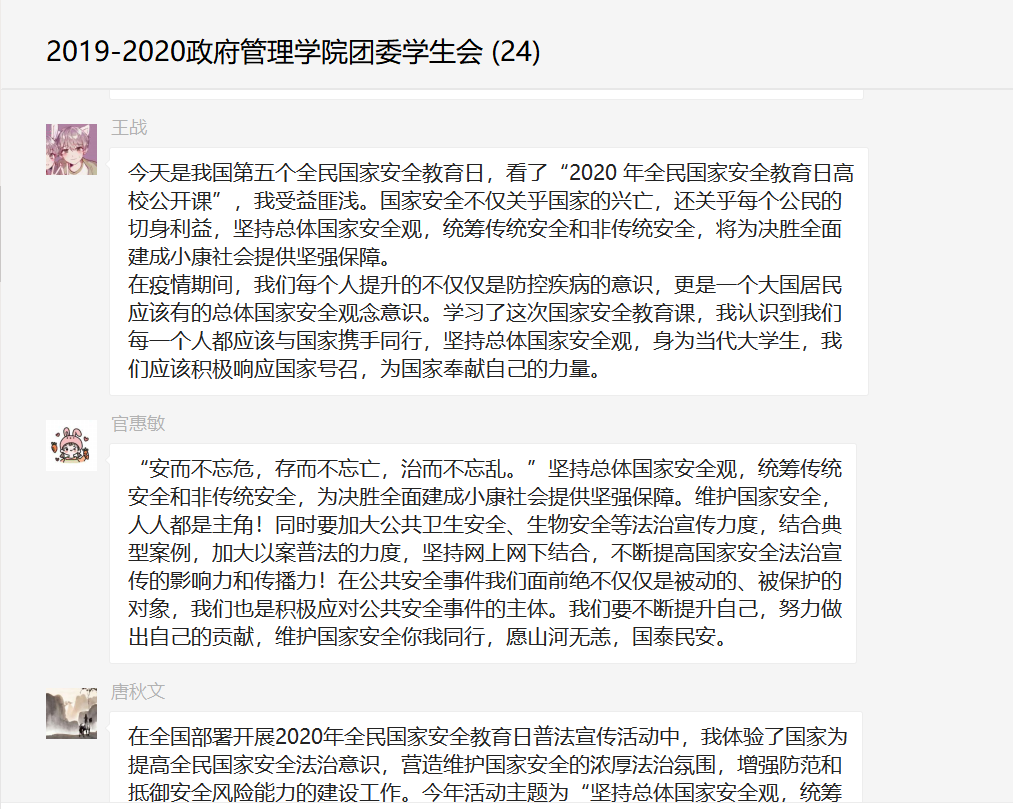国家安全乃是青年之责。正值我国第五个全民国家安全教育日,加强全民国家安全教育对于强化民众的国家安全意识和维护国家主权安全、发展、利益的责任使命感具有十分重要的意义。我国国家安全问题研究发展自新中国成立以来至今有着长久的发展历程,要走中国特色国家安全道路,以人民安全为宗旨,政治安全为根本,经济安全为基础,军事、文化、社会安全为保障,国际安全为依托。对于我们老员工,要利用假期时间完善自我,提升信息辨识能力,不传谣,不造谣,规范网络言论,共同维护国家形象。