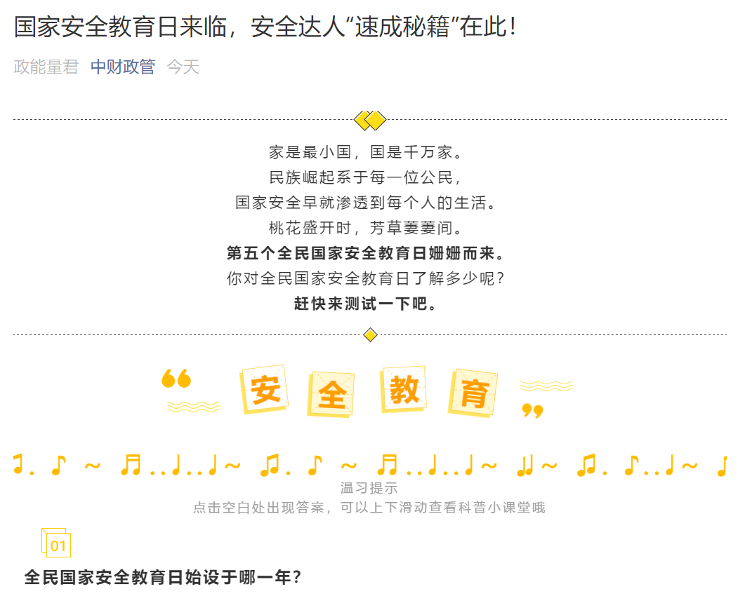 2020年4月15日是第五个全民国家安全教育日。在2015年7月1日,全国人大常委会通过的《中华人民共和国国家安全法》第十四条规定,每年4月15日为全民国家安全教育日。在第五个全民国家安全教育日的当下,大众正处于新冠疫情防控的重要阶段,更突显了安全意识的重要性。