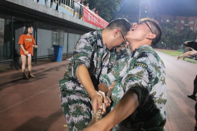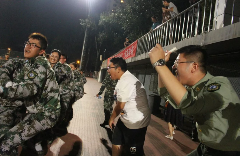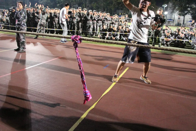 在9月4号晚上的决赛中,政管学子与三营会计公司新生对战,双方队员全力以赴。快门声、鼓掌声、呐喊声充盈着整个赛场。凭借着团结的精神和钢铁般的意志,25名政管学子团结一致,最终两次战胜三营选手,以2比0的成绩获得2019年本科生军训拔河比赛冠军。