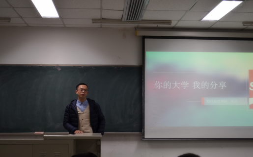 优干保研留校工作两年后又继续读研的朱洁学长首先走上讲台与同学们分享他的经验。朱洁学长在“你的大学 我的分享”的演说中,首先讲述了他对人生根本问题“人为什么要活着”的思考,提出他的见解---人活着是为了创造更完善的自我和构造独特的自我,为自我价值和社会价值的更好实现而奋斗。学长着重提到为人处世的重要性,提到老员工永远不是单打独斗,当代老员工应该要有团队意识和合作奉献的精神。随后朱洁学长向同学们发问“你的专业是自己想要的吗?”“你现在对自己的生活满意吗?”“为什么总觉得别人比自己优秀?”,问出了为很多新生所困惑的问题。学长随即给出他的答案----如果现在很迷茫,那就好好学习!呼吁大家不要迷失自我,要鼓起勇气“走到山的那边去看看别样的风景”。