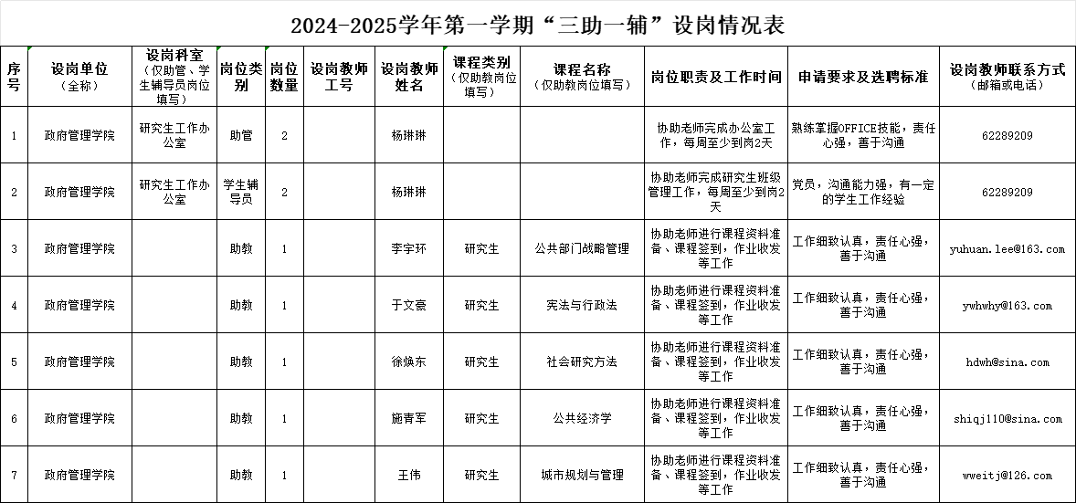 2024-2025学年第一学期“三助一辅”设岗情况表
