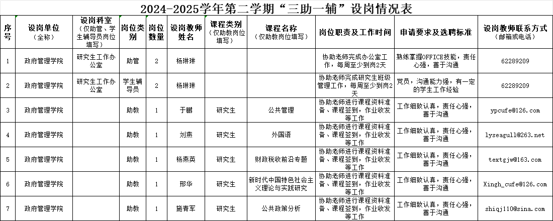 2024-2025学年第二学期“三助一辅”设岗情况表