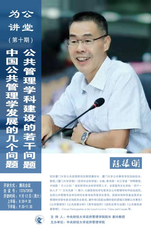 嘉宾简介:陈振明,现任厦门大学公共政策研究院教授兼经理, 厦门大学公共事务公司创始经理、教授,《厦门大学学报》(哲学社会科学版)主编,全国宣传文化系统“四个一批人才”(“文化名家”);第六、七届国务院学位委员会公共管理学科评议组成员,全国公共管理专业学位研究生教育指导委员会委员,国家自然科学基金委员会管理科学部专家咨询委员会委员。著作有《国家治理转型的逻辑》《理解公共事务》《公共管理学》《公共政策分析》《竞争型政府》《政府改革与治理》《公共服务质量管理》、Citizen Participation at the Local Level in China and Canada等。