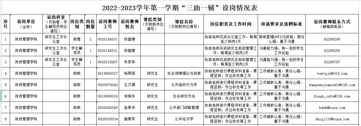 2022-2023学年第一学期“三助一辅”设岗情况表