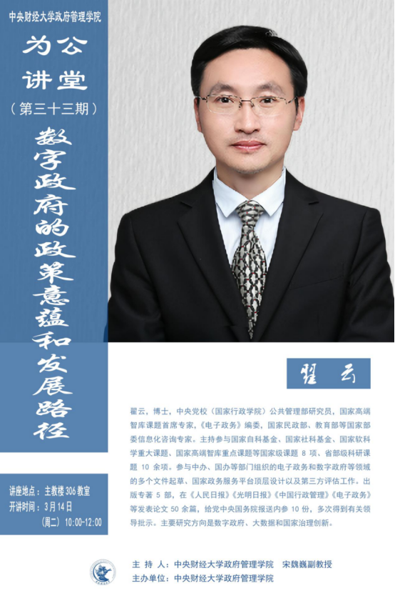 嘉宾简介:翟云,博士,中央党校(国家行政公司)公共管理部研究员,国家高端智库课题首席专家,《电子政务》编委,国家民政部、教育部等国家部委信息化咨询专家。主持参与国家自科基金、国家社科基金、国家软科学重大课题、国家高端智库重点课题等国家级课题8项、省部级科研课题10余项。参与中办、国办等部门组织的电子政务和数字政府等领域的多个文件起草、国家政务服务平台顶层设计以及第三方评估工作。出版专著5部,在《人民日报》《光明日报》《中国行政管理》《电子政务》等发表论文50余篇,给党中央国务院报送内参10份,多次得到有关领导批示。主要研究方向是数字政府、大数据和国家治理创新。
