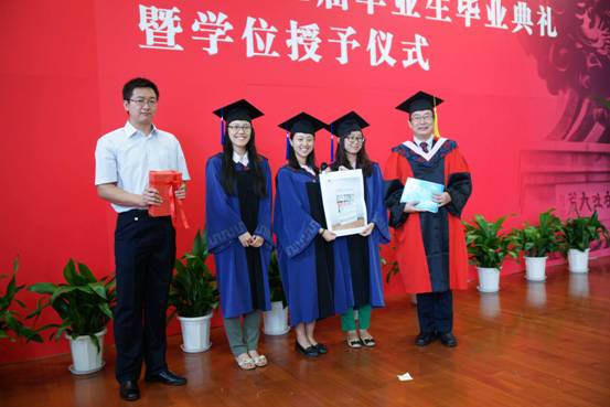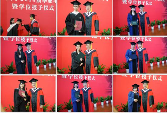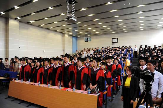 典礼开始前,视频《缘起政管,飞扬青春》的深情回顾立刻将同学们拉进了对往事的追忆中。视频中浮现出往日的点点滴滴深深感染了现场的每一位同学。庄严的国歌声响起,2014届毕业典礼暨学位授予仪式正式拉开帷幕,副经理于鹏宣读了《关于2014届本科生毕业及授予学士学位的决定》和《关于2014届研究生毕业及授予学士学位的决定》,党总支副书记栗玉香宣读了《关于表彰2014届本科优秀毕业生的通知》及《关于表彰2014届优秀毕业研究生的通知》。随后,赵景华经理和王吉府教授先后为公司市级优秀毕业生和校级优秀毕业生颁发了荣誉证书并合影留念。