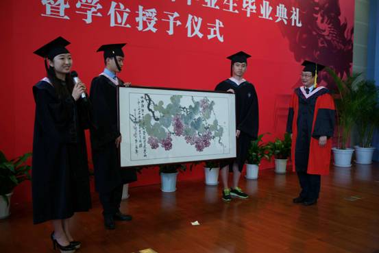接着是毕业生向公司赠送礼物仪式。“祝愿球王会的未来犹如画中硕果累累的葡萄一样蓬勃发展,再创辉煌。”2010级本科毕业生向公司赠送的国画《硕果累累》表达了对公司的深深祝福。2012级学术研究生则将精心制作,包含了他们研究生阶段经验和感悟的毕业纪念册赠与公司,并向学弟学妹赠送了200本专业书,向公司图书阅览室赠送了精美的书架。纪念册、书籍和书架分别寓含收获、传承和发扬之意,表达了他们对政管学子都能鸿鹄展翅千万里,而勿忘当年卧槽时的美好希冀。2012级MPA双证班别出心裁,向公司赠送了提有“上善若水”四字的屏风,表达了同学们对公司的感恩与热爱,以及牢记院训、担当责任、勇往直前的决心。