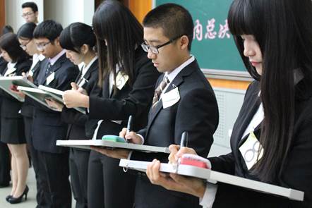 在“市长PK”环节,模拟市长作为团队的核心,他们之间个人的较量自然成为本次比赛最为激烈的部分。专家评委王伟老师以如何“让APEC蓝常态化”为关注点,向“市长们”发问。“市长们”依次条理清晰、简洁明了的作答,可谓各有千秋,难分伯仲。最终,通过来自19个公司的21名大众评审的现场投票,“bulingbuling”队市长贺顶丹成为本届大赛的最佳市长。