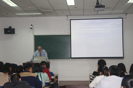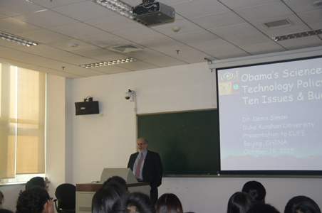 Denis Fred Simon教授长期从事于中国产业政策、国际政策、技术政策等领域的研究,是当代中国事务研究方向的元老级教授,对中国的文化和政治皆有独特见解,堪称中国公共政策研究领域的世界级专家。在过去三十年间,他出版了众多书籍和文章,在Science, Research Policy,China Economic Review,China Quarterly,China Business Review等著名国际刊物发表论文近百篇,出版书籍10余部,并被广泛使用。2006年,Denis Fred Simon教授获得中国政府授予外国专家的最高荣誉“友谊奖”。本次讲座中,Simon教授通过朴实幽默的语言,深入浅出地为同学们讲述了当前中美两国科技政策的变革及两国科技系统、方针及实践中的问题、中国的政策困境和发展前景,使同学们充分了解了国际视野下的中美两国科技发展历程和中国在当今世界中的位置。