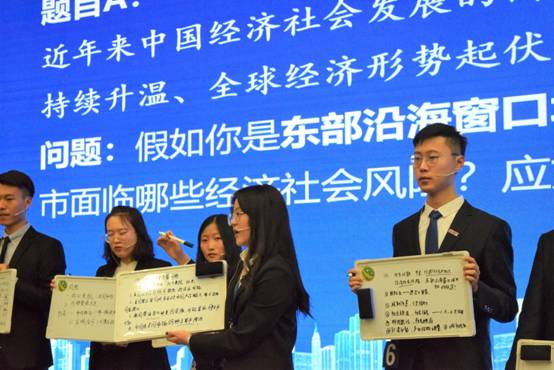 在激动人心的“市长终极PK”环节,大赛评审委员会执行主席纪丰伟先生现场抽取试题:2019年中美贸易摩擦持续升温、全球形势起伏变化,我国经济下行压力加大。假如你是东部沿海窗口城市的市长,你认为现阶段你管辖的城市面临哪些经济社会风险,应如何防范?针对这一问题,各位“市长”都发表各抒己见。有的选手以上海市为例,提出就业岗位有可能会因此减少,而政府应该建立健全社会保障机制,给失业的人做好就业指导;也有选手认为政府应该力求把损失降到最低,将商业往中亚地区和西南发展。“员工市长”发言完毕后,评委们对部分“员工市长”进行提问,并根据场上选手的表现,每人提名1位“最佳市长”候选人。