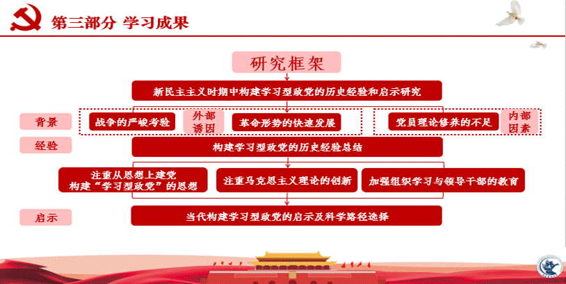“四史明鉴,不忘初心回望来路;一心向党,肩负使命共创未来。”“四史明初心”小组回溯历史,总结经验,认识到建设一个新时代学习型政党的重要性,指出新时代青年党员应当加强建设自身,坚定理想信念,继承弘扬优良传统,做到实践与理念相结合。