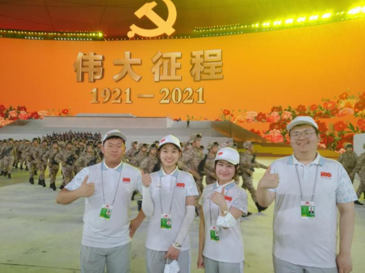 公司刘博雅、王卓娅、赵治涵、于泽洋4名同学作为志愿者团队成员“庆祝中国共产党成立100周年文艺演出《伟大征程》”志愿服务工作,全心全意完成站点执勤、人员引导等服务工作,参与保障演出顺利进行,圆满完成了党和国家交予的光荣任务。