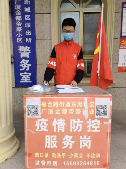 王健豪的家乡甘肃也有疫情蔓延,疫情发生后,当地立即升级疫情防控机制,但是社区出入人员众多,志愿者人手却不够,在了解情况后,作为一名共青团员和入党积极分子,王健豪立马向社区报名疫情防控志愿者,从三月以来,王健豪每有空闲实践都会去志愿岗协助工作人员进行出入登记、体温检测、发放口罩等工作,节假日人流车流大的时候,王健豪也主动在夜里与工作人员换班值班。在甘肃疫情好转后,社区防疫工作压力减轻,王健豪又联系了当地政府部门,报名成为防疫志愿者,在政府办公楼门口对访客进行核酸检测报告查验、访客登记扫码、体温检测、配合部门消毒消杀等志愿工作。