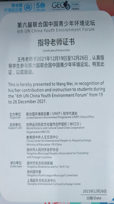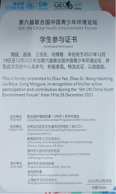 2021年12月18日至26日,联合国环境规划署驻华代表处主办的第六届联合国中国青少年环境论坛于扬州、上海举行,旨在为青年提供最为先进的空气、淡水、海洋、土地和生物区系/生物多样性的状态和趋势知识,鼓励各个利益相关方,尤其是青少年采取行动,实现“地球健康,人类健康”。同时,作为每年热爱关心环境议题的青少年的大聚会,青少年代表将在论坛上分享自己的环境创新方案,为应对共同的环境挑战做出贡献。