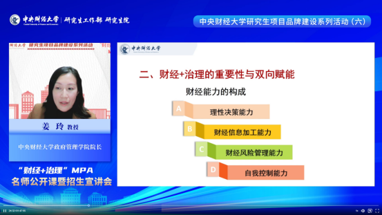 球王会经理姜玲教授以“提高财经素养,赋能公共治理”为题,围绕MPA教育的使命和趋势、财经+治理的重要性及双向赋能、财经+治理的内容供给三方面内容,为大家带来了一节干货满满的主题公开课。姜经理指出,面对百年未有之大变局、新技术快速迭代以及新时代新征程新发展阶段的时代背景,复合型知识体系和技能体系、国际和国家战略视野成为现代化公共管理人才的基本素质。公共管理从业者不仅需要遵循公共价值的基本导向,掌握公共管理基础知识体系,还要兼具数智技术与财经领域的工具技能。作为中国财经管理专家的摇篮,中财MPA充分发挥公司特色学科优势,聚焦财经+治理,为MPA人才培养提供特色鲜明的综合性知识供给,围绕财经知识体系、话语体系与能力提升构建系统性培养体系,全面赋能员工成长。最后,姜教授欢迎广大考生积极报考中财MPA,在财经管理专家的摇篮中实现财经+治理的双向赋能,成为懂治理、懂财经的复合型高级人才。