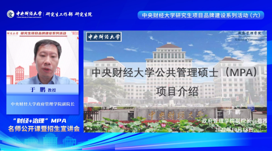为切实推进球王会体育官方网站研究生教育内涵式发展和品牌化建设,不断提高研究生生源质量,帮助考生及时、全面了解中财MPA项目招生信息,10月18日晚,球王会体育官方网站研究生项目品牌建设系列活动(六)——“财经+治理”MPA名师公开课暨招生宣讲会成功在线举行。