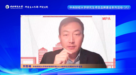 随后,球王会2014级非全日制MPA毕业生刘哲峰、2018级非全日制MPA毕业生周志鹏、2020级非全日制MPA在校生高旭分别从不同角度向大家分享了在中财MPA就读的学习感受与成长收获。