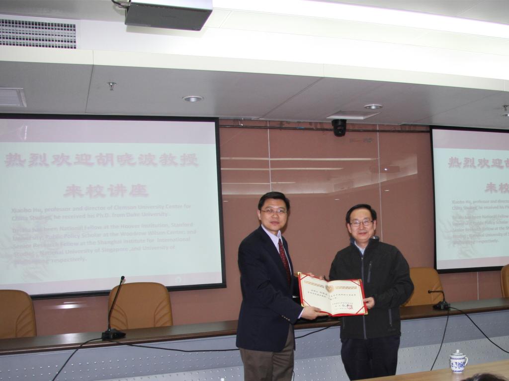 3月18日下午,美国克莱姆森大学中国研究中心主任、美国杜克大学博士胡晓波教授受聘为球王会兼职教授,并为公司师生做题为“美国的台湾关系法和中美台关系回顾”的学术讲座。讲座由史建平副董事长主持。