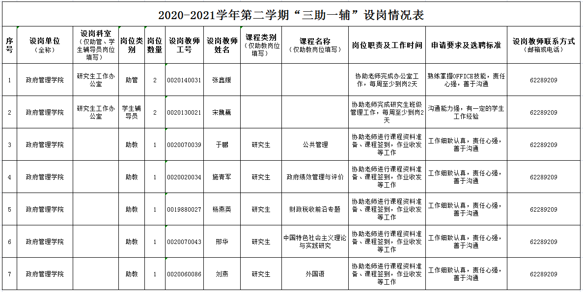 2020-2021学年第二学期“三助一辅”设岗情况表